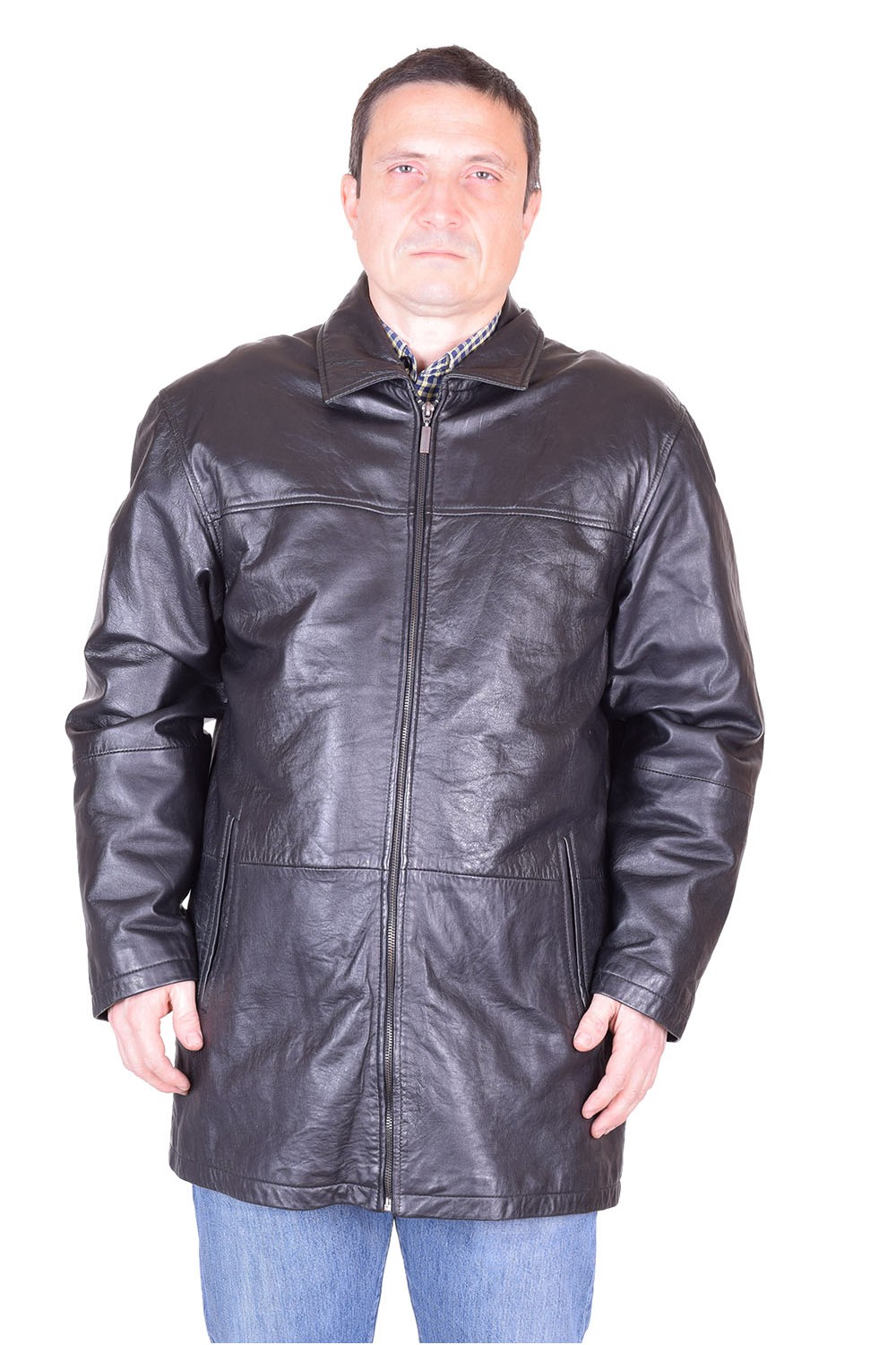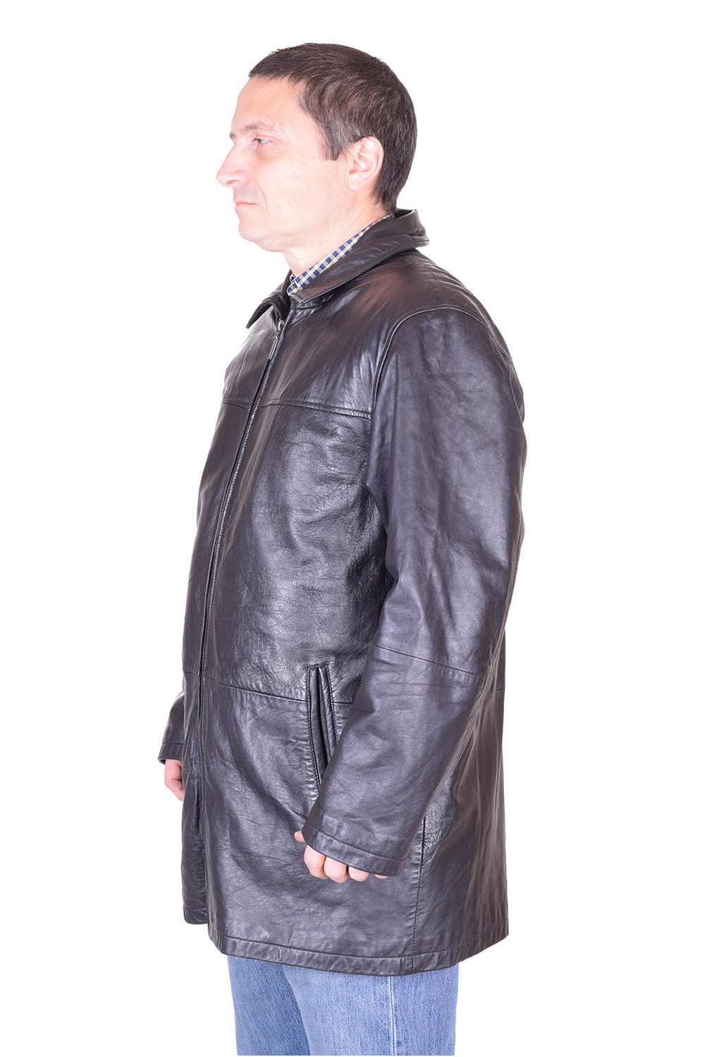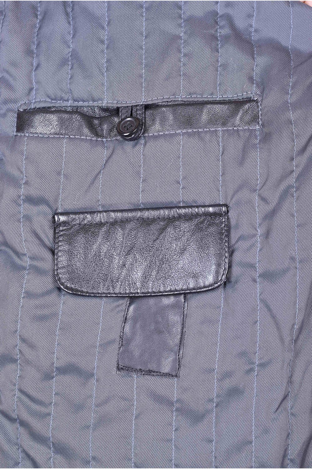 Geacă neagră din piele naturală moale și consistentă cu fermoar metalic, căptușeală din poliester și două buzunare în fața. Bust: 126 cm. Lungime: 83 cm. Talie: 120 cm. Șold: 120 cm. Umeri: 52 cm. Distanta dintre umeri este măsurată de la cusătură la cusătură mâneci. Lungime mânecii: 62 cm. Modelul este pentru înălțime de 170 cm.