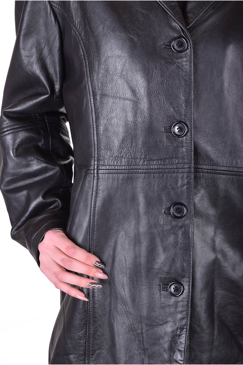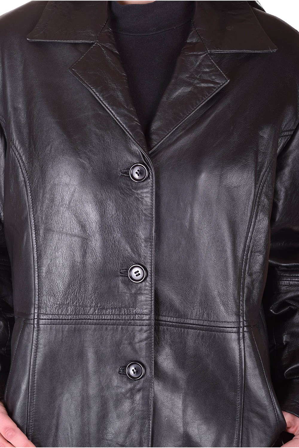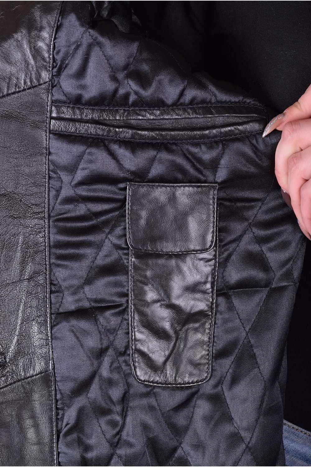Geacă din piele naturală moale și consistentă cu două buzunare în fața, cusături decorative și nasturi negri. Bust: 112 cm. Lungime: 86 cm. Talie: 104 cm. Șold: 114 cm. Umeri: 48 cm. Distanta dintre umeri este măsurată de la cusătură la cusătură mâneci. Lungime mânecii: 61 cm. Modelul este pentru înălțime de 170 cm.