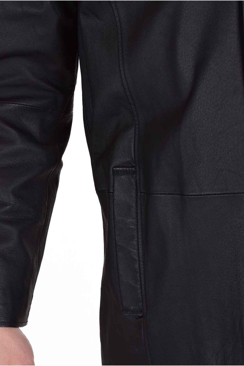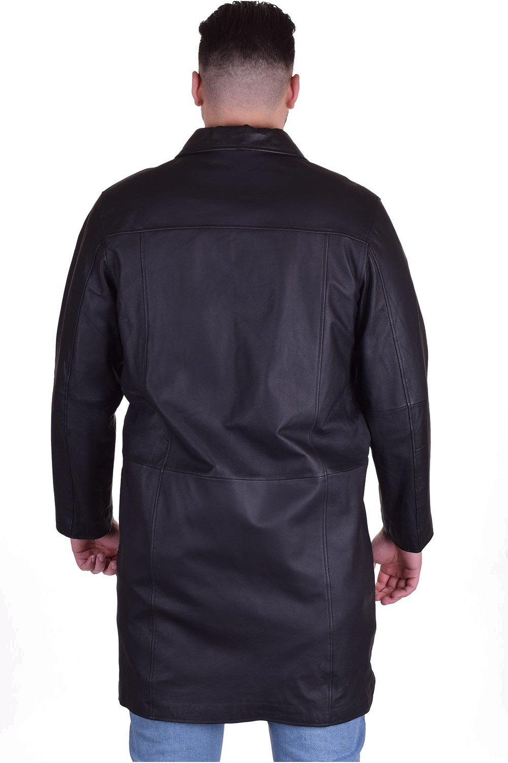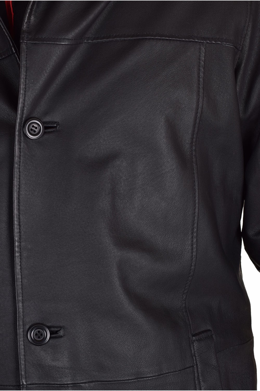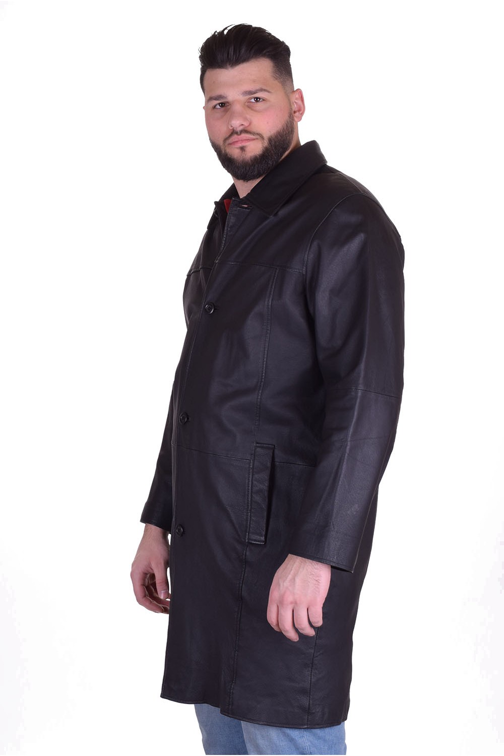 Geacă de bărbați din piele moale și delicată cu nasturi, două buzunare în fața și căptușeală din poliester. Bust: 130 cm. Lungime: 107 cm. Talie: 126 cm. Șold: 126 cm. Umeri: 52 cm. Distanta dintre umeri este măsurată de la cusătură la cusătură mâneci. Lungime mânecii: 65 cm. Modelul este pentru înălțime de 202 cm.