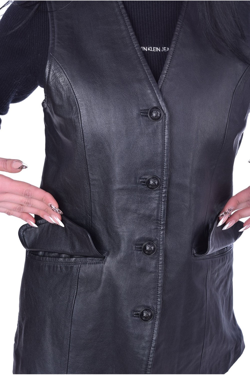 Vestă de damă din piele consistentă cu două buzunare în fața, căptușeală din poliester și nasturi. Bust: 88 cm. Lungime: 65 cm. Talie: 84 cm. Șold: 88 cm. Umeri: 35 cm. Distanta dintre umeri este măsurată de la cusătură la cusătură mâneci. Modelul este pentru înălțime de 170 cm.